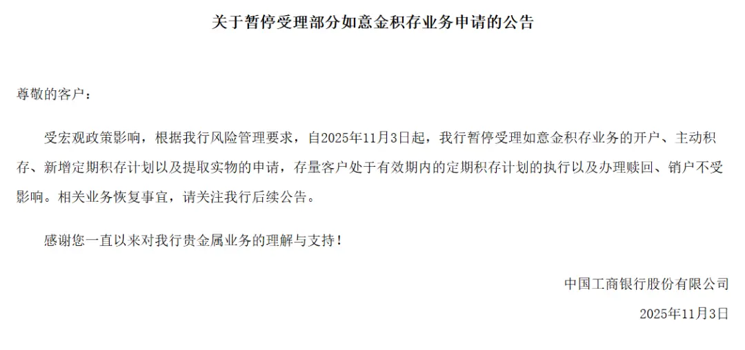 比如工商銀行在11月3日上午發(fā)布公告稱,受宏觀政策影響,根據(jù)工商銀行風(fēng)險(xiǎn)管理要求,自2025年11月3日起,工商銀行暫停受理如意金積存業(yè)務(wù)的開(kāi)戶、主動(dòng)積存、新增定期積存計(jì)劃以及提取實(shí)物的申請(qǐng)。