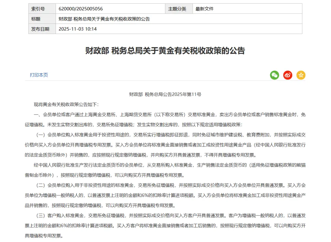 但在11月1日,財(cái)政部、國(guó)家稅務(wù)總局聯(lián)合發(fā)布了一份重磅文件——《關(guān)于黃金有關(guān)稅收政策的公告》。