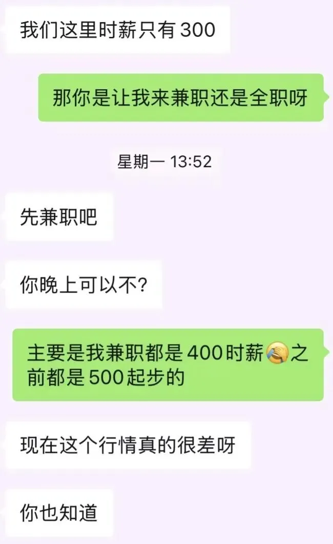 5月份,她接到一份兼職,盡管她清晰地說(shuō)明了能接受的最低時(shí)薪是400塊,還是被對(duì)方砍價(jià)到300塊。對(duì)方告訴她:“每年都有新主播入行,工資下滑是非常正常的事情。”思辰堅(jiān)決不松口,于是在直播3個(gè)小時(shí)后,她被強(qiáng)行下播。