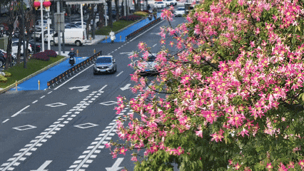 如果說主題分段是工程的“骨架”,那么高標準構建的慢行系統(tǒng)則是其最為動人的“血脈”。本次升級全面貫徹 “以人為本” 的核心理念,傾力打造以3米寬彩色海洋藍瀝青非機動車道為核心的舒適慢行網絡。