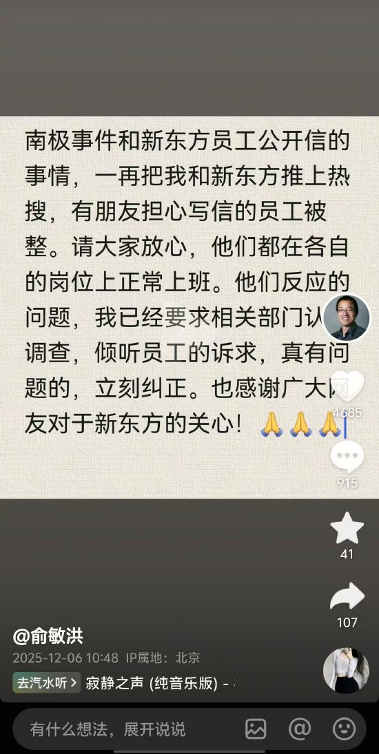 俞敏洪表示,“南極事件和新東方員工公開信的事情,一再把我和新東方推上熱搜,有朋友擔(dān)心寫信的員工被整。請(qǐng)大家放心,他們都在各自的崗位上正常上班?!?/p>